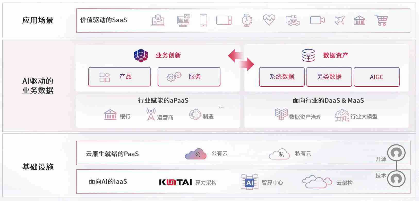 数字时代,,,围绕企业数字化转型的关键要素,,,OK钱包数码开创性的提出数云融合战略和技术体系框架,,,着力在云原生、、、、数字原生、、、AI原生和信创产业上架构产品和服务能力,,,,为处在不同数字化转型阶段的快消零售、、、、汽车、、、、金融、、、医疗、、、政企、、、、教育、、、、运营商等行业客户提供泛在的敏捷IT能力和融合的数据驱动能力,,构建跨界融合创新的数字业务场景和新业务模式,,,助力企业级客户建立面向未来的核心能力和竞争优势,,,,全面推动社会的数字化、、、智能化转型升级。。